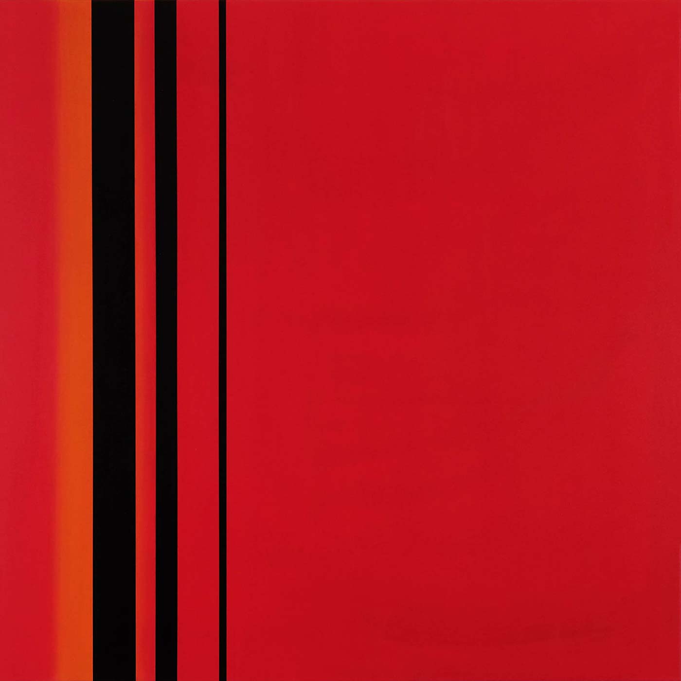 Nominiert für den 20. Kunstpreis des Landkreise Fürstenfeldbruck: Dieses quadratische Bild in einem warmen satten Rot wird am linken Rand durch ein warmes Orange mit sanftem Licht versehen. Dieses gibt dem dominanten Rot behutsam Auflockerung und das Gefühl von Räumlichkeit. Dieses Gefühl wird verstärkt durch drei unterschiedlich breite durchgängig senkrechte samtig schwarze Linien, deren Breite und Abstand von einander in einer klaren Ordnung gestaltet sind und in ihrer Gesamtheit das Rot überlagern. Die erste schwarze Senkrechte liegt verdunkelnd auf dem lichterfüllten Orange, das sich jedoch am rechten Rand der breiten Linie noch für einen Moment erhalten kann, bis auch dieses mit dem warmen Rot verschmilzt.