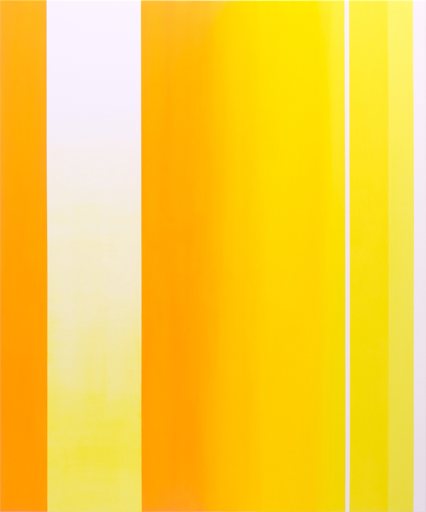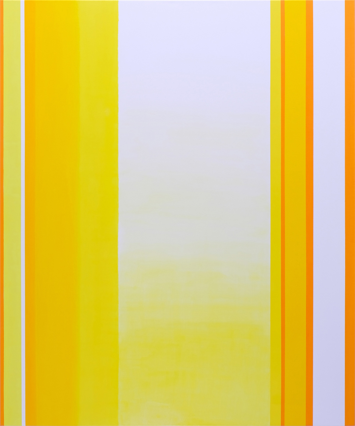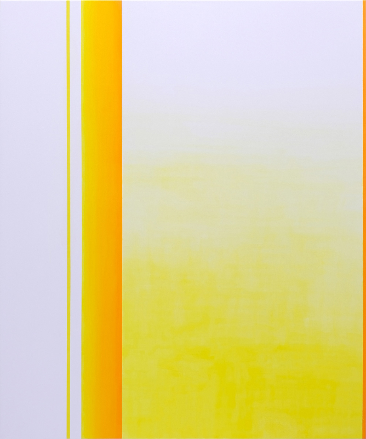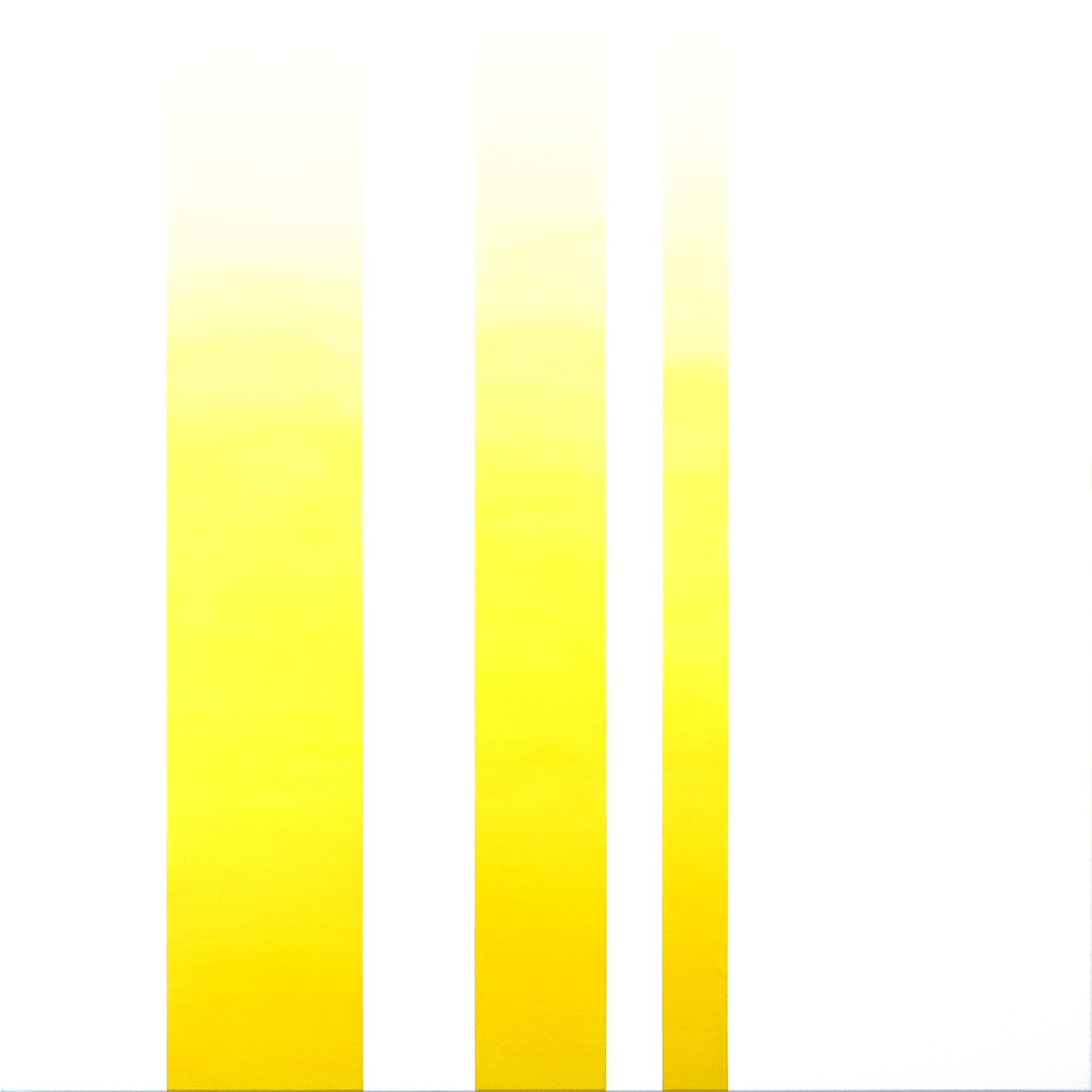 Nominiert für den 7. Internationalen André-Evard-Preis, Kunsthalle Messmer, Riegel am Kaiserstuhl: Drei vertikale rechteckige Farbflächen durchziehen die gesamte Höhe des Bildes in den beiden ersten Dritteln in einer spannungsreichen und dennoch ruhevollen klaren Ordnung. Warmes Gelb erleuchtet den unteren Bereich dieser unterschiedlich breiten, von links nach rechts schmäler werdenden Farbflächen. Die in diesen senkrechten Farbflächen lasierend aufgetragenen Farbschichten gehen in sanftem horizontalem Auftrag aufsteigend in kältere Gelbtöne über, bis sie im oberen Bereich mit der sie umgebenden Fläche zu verschmelzen scheinen. Eine imaginäre Linie erhält jedoch bis zum oberen Ende die exakte Formgebung in einem strahlenden Weiß, das durch die reflektierenden Farbpigmente eine besonders hohe Leuchtkraft erhält. Bei längerer Betrachtung des Bildes können strahlende Farbflächen in hellem Neon-Blau oder Neon-Lila erscheinen und sogar bis über den Bildrand hinaustreten. Zeitweise nimmt man weitere gelbe Senkrechte wahr, die eine scheinbare Bewegung der gelben Farbflächen fortsetzen.